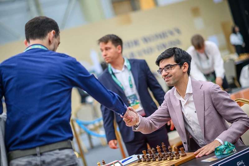 GM Anish Giri shaking hands with GM Robert Hovhannisyan