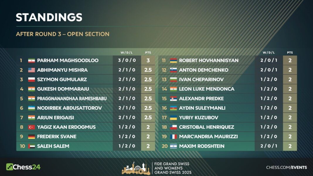GM Parham Maghsoodloo called GM Alireza Firouzja’s bluff to take the sole lead in the 2025 FIDE Grand Swiss, after co-leader GM Anton Demchenko succumbed to GM Arjun Erigaisi’s pressure. GM Praggnanandhaa Rameshbabu took advantage of GM Boris Gelfand’s fighting spirit, and was joined on 2.5/3 by World Champion Gukesh Dommaraju and GMs Nodirbek Abdusattorov, Abhimanyu Mishra, and Szymon Gumularz. 14-year-old GM Yagiz Kaan Erdogmus missed a win over GM Vincent Keymer by the smallest of margins.Â