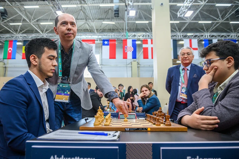 GM Nodirbek Abdusattorov vs. GM Yağız Kaan Erdoğmuş with GM Rustam Kasimdzhanov making the ceremonial first move