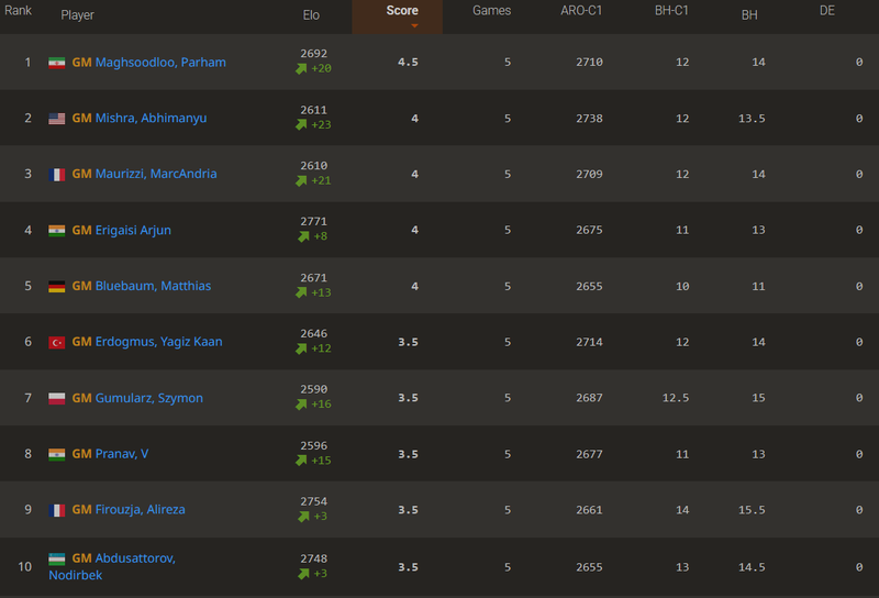 Seven of the top 10 boards were decisive, with all top five boards having a winner. The tournament leader, GM Parham Maghsoodloo, won again, this time against GM Richard Rapport, while the chasing pack on 4/5 includes GM Abhimanyu Mishra, who defeated world champion GM Gukesh D, GM Marc’Andria Maurizzi, who won against GM Vincent Keymer, GM Arjun Erigaisi, who triumphed over GM Nikita Vitiugov, and GM Matthias Bluebaum, who got the better of GM Praggnanandhaa R. GM Yağız Kaan Erdoğmuş held GM Nodirbek Abdusattorov to a draw after playing 190 moves in a span of over 8 and a half hours.