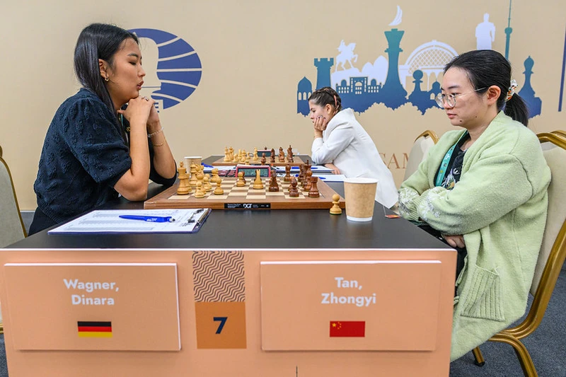 After her loss in round 6, GM Tan Zhongyi bounced back with a topsy-turvy win against IM Dinara Wagner. Tan was lost soon after the opening, but she clawed her way back and achieved equality, outplaying Wagner twice as Tan blundered her advantage away around move 78, forcing her to win the game a second time.