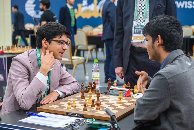On board 5, GM Nikolas Theodorou and GM Vincent Keymer went for a very correct draw. GM Shakhriyar Mamedyarov and GM V Pranav also were better against their opponents, GM Shant Sargsyan and GM Jorden van Foreest, respectively, but ultimately could not convert, drawing on move 45 in the former game and move 44 in the latter game. GM Anish Giri also had an advantage against GM Abhimanyu Mishra, potentially a near winning one, but drew after going for the inaccurate 23. f4?!.