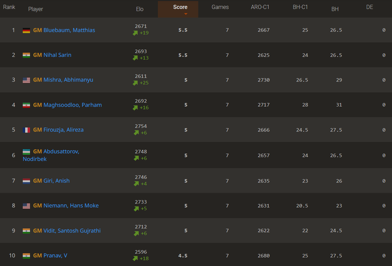 GM Matthias Blübaum and GM Nihal Sarin share the lead after defeating GM Parham Maghsoodloo and GM Arjun Erigaisi, respectively, while the chasing pack on 5/7 includes seven players: GM Abhimanyu Mishra, GM Parham Maghsoodloo, GM Alireza Firouzja, GM Nodirbek Abdusattorov, GM Anish Giri, GM Hans Moke Niemann, and GM Vidit Santosh Gujrathi.