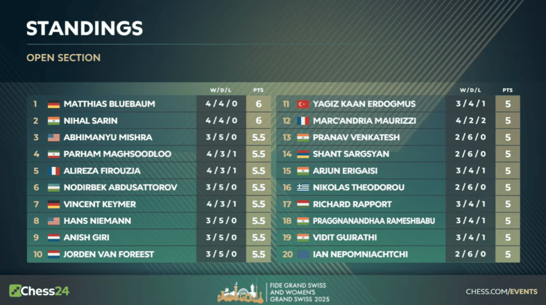 2 GM Nodirbek Abdusattorov (5.5) 2748 GM Matthias Bluebaum (6) 2671