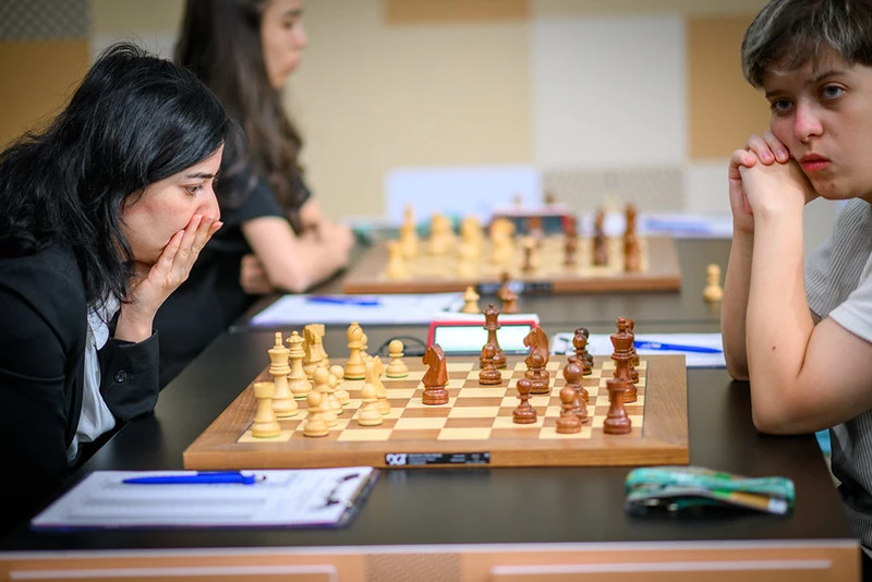 IM Stavroula Tsolakidou was losing for much of her game against GM Harika Dronavalli, but Harika wrongly evaluated a pawn grab, allowing Tsolakidou to bounce back and hold the draw.