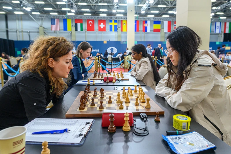 After winning a topsy-turvy game against GM Mariya Muzychuk, GM Vaishali Rameshbabu is back in the joint lead with GM Kateryna Lagno, who herself missed a chance against GM Tan Zhongyi. Three players are close behind on 7/10: GM Tan Zhongyi, IM Song Yuxin, and GM Bibisara Assaubayeva, with two more players on 6.5/10: IM Ulviyya Fataliyeva and GM Irina Krush.