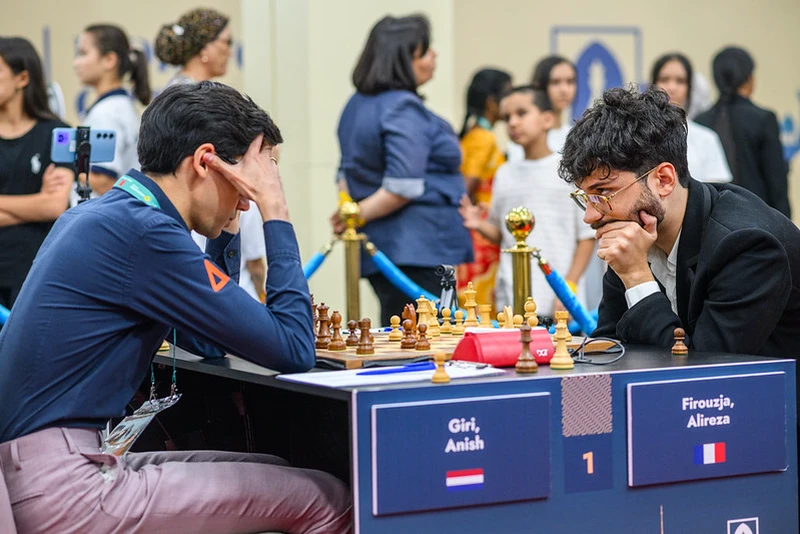 Board 5, GM Abhimanyu Mishra vs. GM Maxime Vachier-Lagrave, saw a slightly theoretical draw, but one from an opening which is rarely played at the highest level: the Four Knights Sicilian Defense. On board 7, GM Ian Nepomniachtchi tried, for 120 moves and over 7 hours, to win against GM Nodirbek Yakubboev, but Yakkuboev did not crack. Meanwhile, boards 8 (GM M. Amin Tabatabaei vs. GM Shakhriyar Mamedyarov) and 9 (GM Jorden van Foreest vs. GM Javokhir Sindarov) saw very correct draws, even though GM M. Amin Tabatabaei and GM Javokhir Sindarov, respectively, had some chances to play for more.