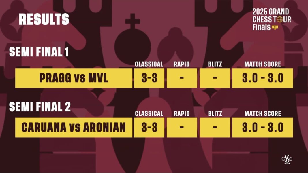 GM Praggnanandhaa Rameshbabu blundered with a second on his clock to turn a promising position into a pawn-down endgame, but GM Maxime Vachier-Lagrave missed a win as their 2025 Grand Chess Tour Finals semifinal began with a draw. The other match-up also started peacefully, as GM Fabiano Caruana failed to follow through on an interesting opening novelty against GM Levon Aronian.