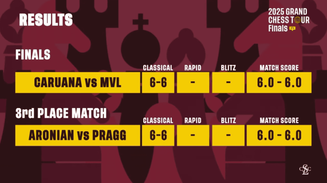 The 2025 Grand Chess Tour Finals is taking place from September 28 to October 3 in Sao Paulo, Brazil. The $350,000 final event of the 2025 Tour sees the top-four, GMs Fabiano Caruana, Praggnanandhaa Rameshbabu, Levon Aronian, and Maxime Vachier-Lagrave, compete in a single-elimination knockout. Each match consists of eight games, two classical (6 points for a win, 3 for a draw, 0 for a loss), two rapid (4/2/0), and four blitz (2/1/0). The winner claims the Grand Chess Tour title and the $150,000 top prize.