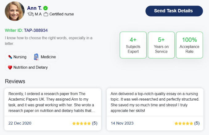 The Academic Papers UK assigned me a dedicated essay writer, Ann T., who was a certified nurse and had years of experience in writing top-notch academic papers on the nursing subject.