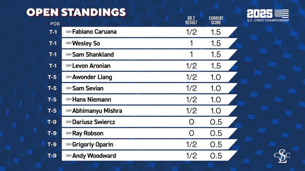 GMs Wesley So and Sam Shankland joined GMs Fabiano Caruana and Levon Aronian in a four-way tie for the 2025 U.S. Chess Championship lead on 1.5/2 after scoring the only wins in round two. So beat his old college roommate GM Ray Robson while Shankland overcame GM Dariusz Swiercz, but the greatest drama came in the draws. 15-year-old GM Andy Woodward had Caruana all but busted out of the opening, while GM Grigoriy Oparin was close to winning against GM Hans Niemann, but the 2700-stars escaped.