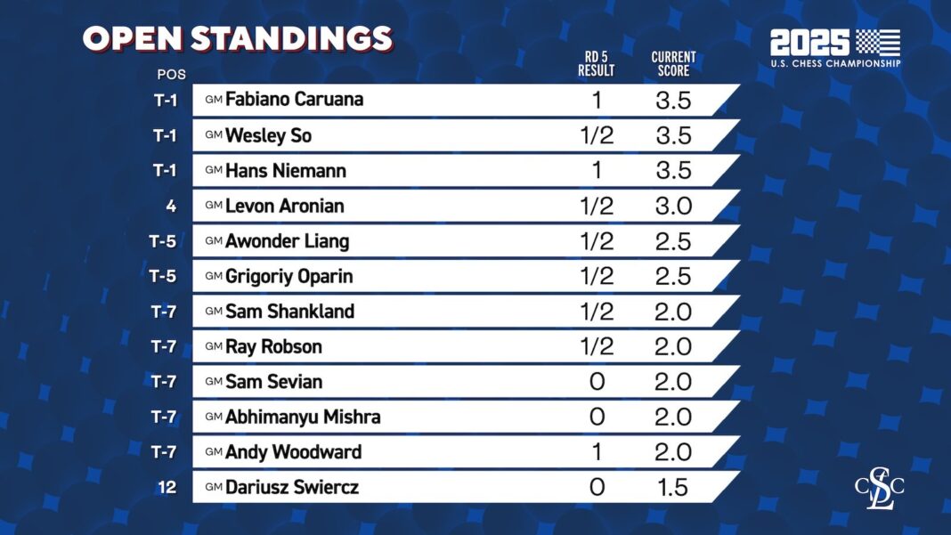 GM Hans Niemann ended GM Abhimanyu Mishra’s 71-game unbeaten streak to join GMs Wesley So and Fabiano Caruana in the 2025 U.S. Chess Championship lead after round five. So’s sole lead ended with a 15-minute draw against GM Levon Aronian, and he was also caught by Caruana, who ground out a win against GM Dariusz Swiercz. The day’s other win was for GM Andy Woodward, who pounced on a blunder by GM Sam Sevian to grab his first victory.