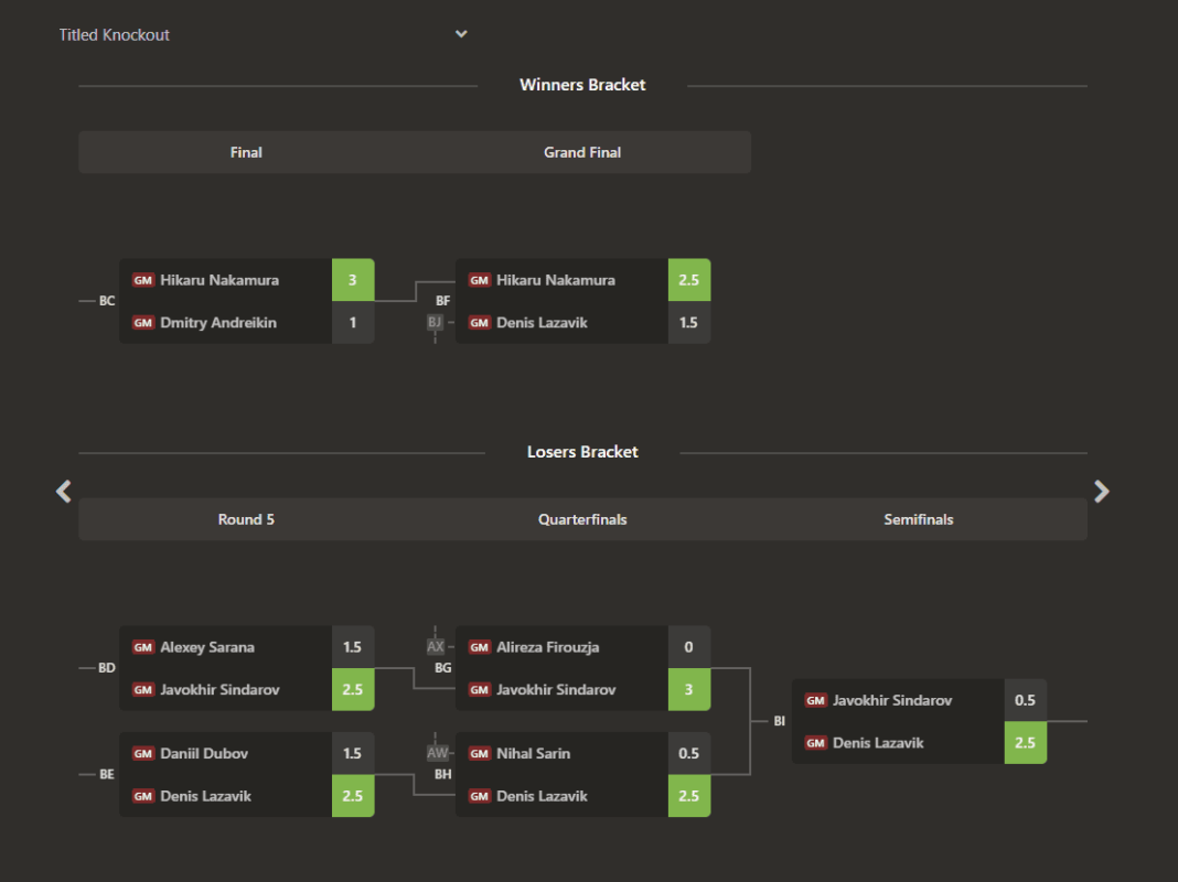 Nakamura went on to defeat Andreikin 3-1 in the Final and Lazavik 2.5-1.5 in the Grand Final. Lazavik lost game one by blundering a rook—though he was likely going to lose on time in the scramble anyway—and never managed to recover, with Nakamura securing three draws to win the match.