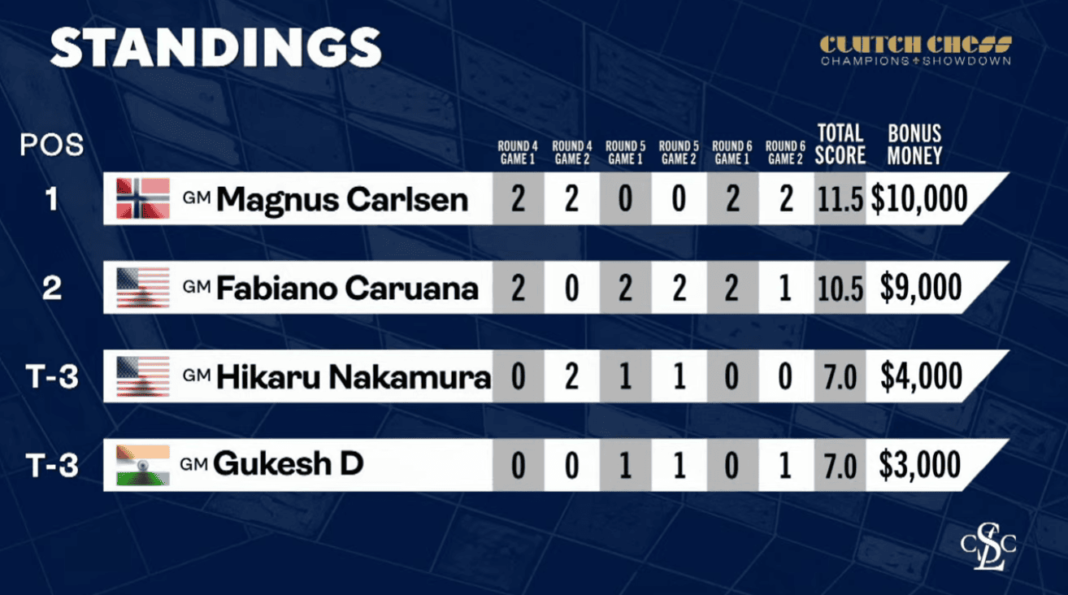GM Magnus Carlsen leads the 2025 Clutch Chess: Champions Showdown after day two. The world number-one won both games in both matches against World Champion Gukesh Dommaraju and GM Hikaru Nakamura, so that he was still in first even with two losses against GM Fabiano Caruana.