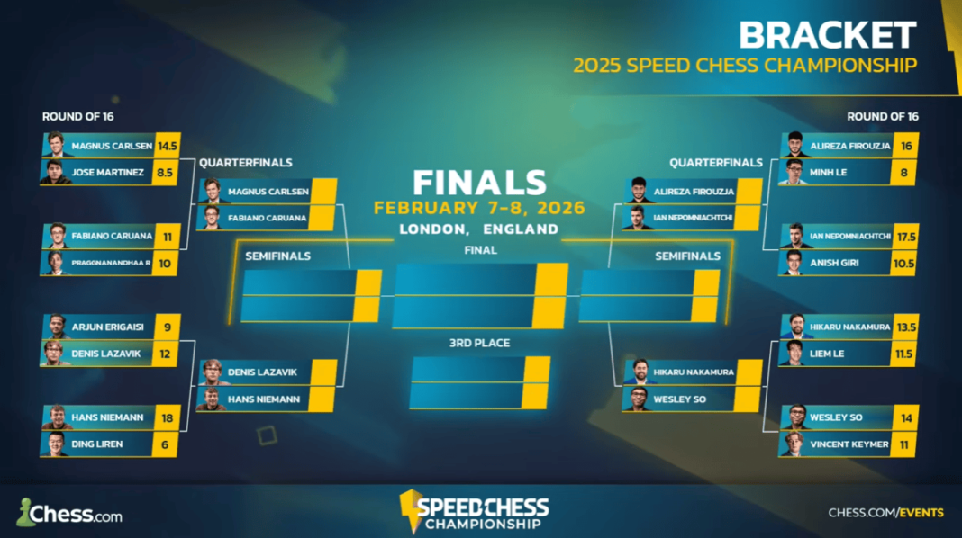 The Speed Chess Championship, which starts on October 12 and culminates with Live Finals on February 8, 2026 in London, is Chess.com’s most important speed chess event. Some of the biggest names in chess compete to determine the best speed chess player in the world. The games are played with time controls of 5+1, 3+1, and 1+1. The prize fund is $250,000.Â
