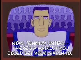 His signing was so austere in terms of aesthetics that my Arsenal Vision Podcast colleague Clive repeatedly referred to him as ‘the bank manager.’ In fact, he bears more than a passing resemblance to the Simpsons portrayal of 1950s and 60s NFL quarterback Johnny Unitas. Unitas is revered by Abe Simpson because he had ‘a haircut you can set your watch by.’