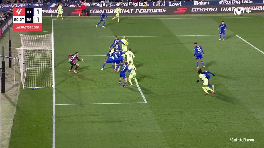 Players in blue and yellow compete fiercely near the goal, with a goalkeeper ready to defend. The intense match sees Getafe tied 1 - 1 with Barca at 80:27. Keep an eye out for a weekly update that might thrill Real Madrid fans as the season progresses.