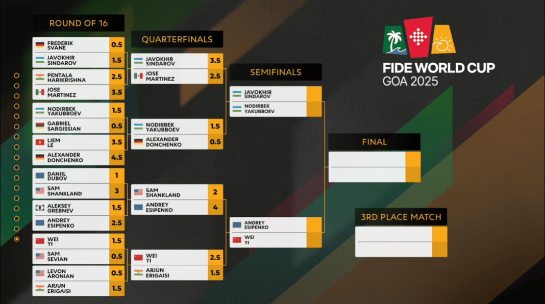 GMs Wei Yi, Javokhir Sindarov, and Andrey Esipenko will join GM Nodirbek Yakubboev in the 2025 FIDE World Cup Semifinals after winning their quarterfinal matches in tiebreaks. Respectively, they defeated GMs Arjun Erigaisi, Jose Martinez, and Sam Shankland.
