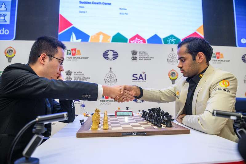 In the rapid tiebreaks, Wei showed exceptional preparation, gaining a huge advantage against Arjun’s French Defense as early as move 9. The position continued to get better for Wei, but on move 27, as the position remained highly complicated, Wei started going astray, and soon enough Wei’s advantage became only symbolic. Arjun comfortably held a draw, with his pair of bishops stopping Wei’s rook and two pawns.