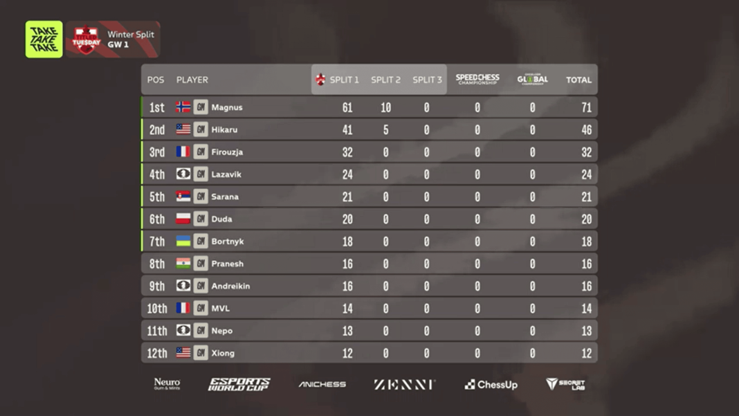 The tournament began the second split in the new Titled Tuesday season, which not only continues to count toward Esports World Cup qualification (as did the last split), but also for the 2026 Chess.com Global Championship (CGC). Carlsen, Movahed, Nakamura, and others are off to a good start.