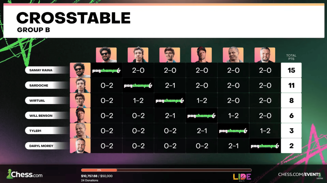 So it was up to Wirtual to win his match to stay in the top three of Group B. He did so by winning both games against Daryl, who, just like in round one, saw his queen trapped in game one, and then lost game two.