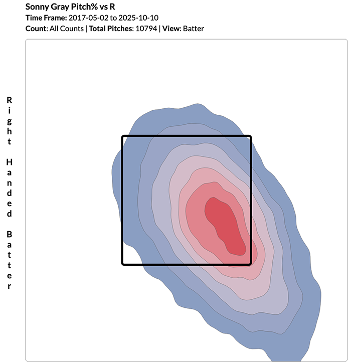 Things aren’t as clear-cut against right-handed batters. Gray’s approach against righties is very simple, and it’s been the same for nearly his entire career: pound the corner low and outside.