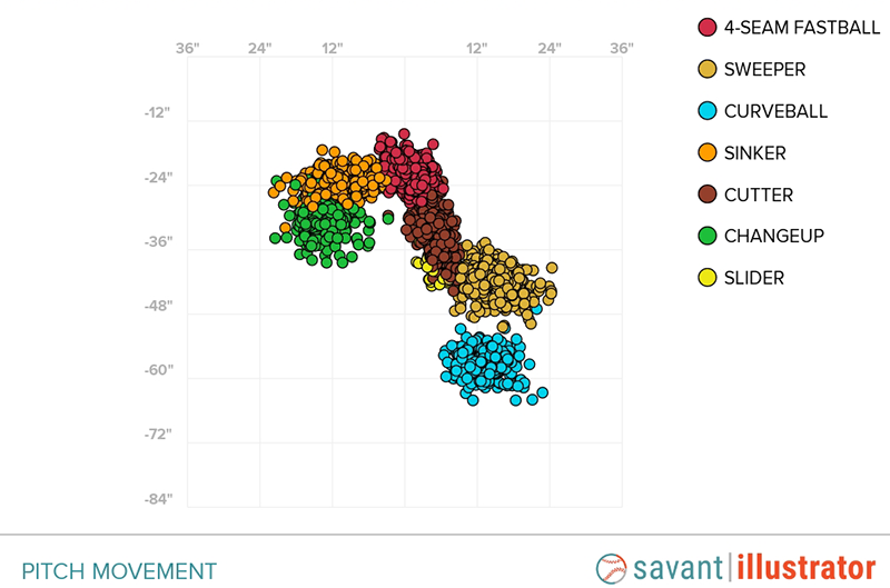 Leading with the sweeper against lefties would likely have several knock-on effects, which is to say that it would require a bit of an overhaul, usage-wise. It might mean backing off the curveball a bit so that lefties couldn’t just sit on something slow and bendy. It might mean mixing in some backdoor sweepers that just catch the outside corner looking for called strikes; right now Gray mainly throws backfoot sweepers looking for swings and misses. It would also make sense to throw a few more sinkers because of the way Gray’s pitches move. He has an extremely high release point, and his four-seamer has a tiny bit of cut rather than arm-side run. It’s basically a cutter (and as Michael Rosen pointed out to me last night, Gray’s cutter is basically a gyro slider). That vertical orientation allows the four-seamer’s movement to mirror the curveball better, while the sweeper and sinker, with their horizontal movement, make a more natural pair: