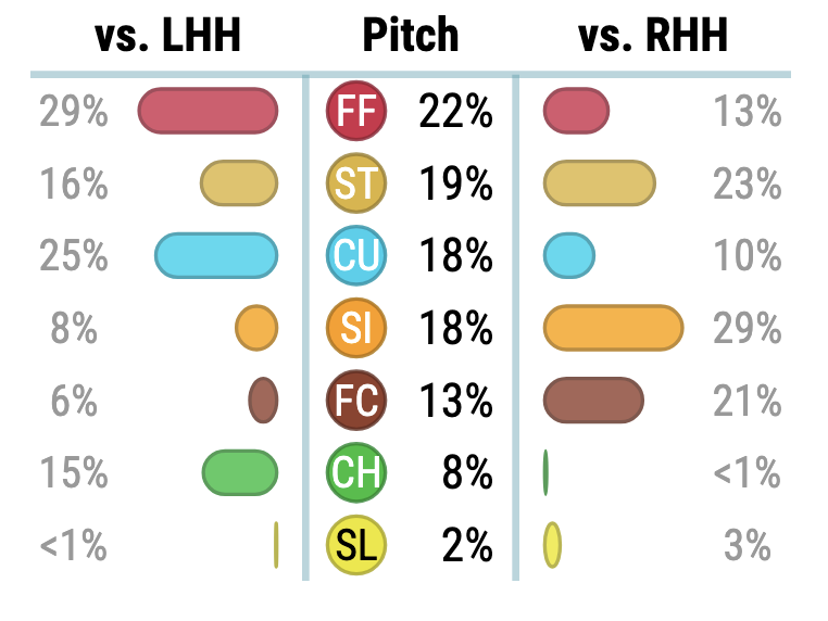 That alone made me curious to see whether and how Gray might look different when he suits up for the Sox next year. Gray fanned those flames further during his introductory Zoom call with the Boston press. Our resident interview ninja David Laurila asked whether Gray is open to changing his pitch mix this coming season. The answer was so thorough and thoughtful that David published the whole thing earlier today. You should read it! But the short answer is yes. Gray is not just open to adjusting his pitch mix. He’s excited about it. He’s excited about talking pitch design and pitch shapes. He’s already talked to Bailey – excuse me, Bails – multiple times and will be talking to him again today. He’s confident in his ability to spin the ball, and he knows “that’s a cult in Boston.” Knowing all this, let’s have some fun looking at Gray’s repertoire and thinking about what might change. Let’s start with his pitch mix, courtesy of this handy new Baseball Savant breakdown: