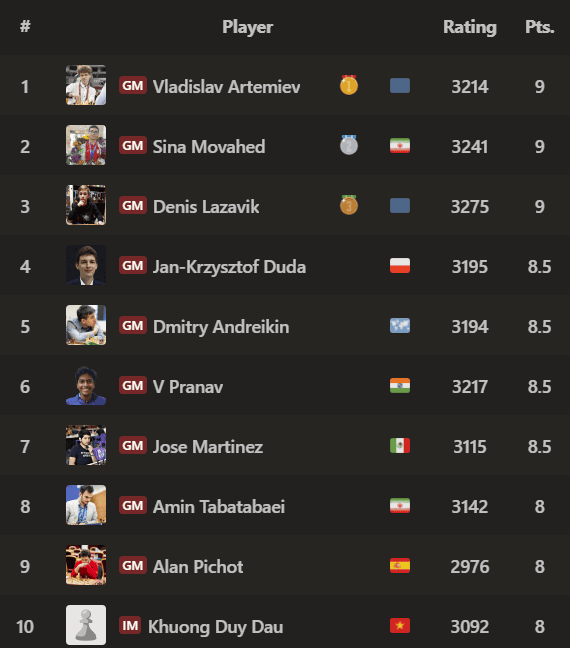 With 8/9 points, Artemiev cruised into first place with draws in the final two rounds against Movahed and GM Denis Lazavik. The three of them tied for first place with 9/11, leaving Artemiev in first, Movahed in second and Lazavik third after tiebreaks applied.