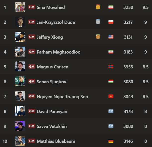 That win brought Movahed to 9.5 points, and even a final round loss against GM Parham Maghsoodloo didn’t allow anyone to catch up to him. Duda recovered from his loss to Movahed and finished second with nine points, edging out third place, GM Jeffery Xiong, on tiebreaks. The top woman’s prize went to FM Rose Atwell with six points.