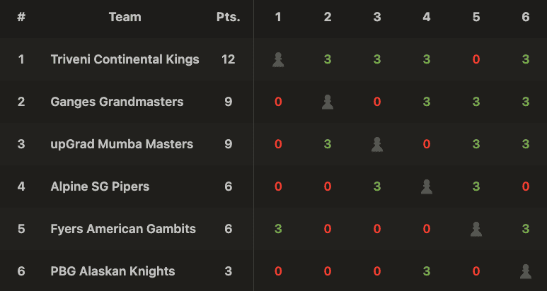 Going into the second half of the round-robin stage, back-to-back champion Triveni Continental Kings continues to be the favorite for the 2025 title in Mumbai. upGrad Mumba Masters is tied for second place with Ganges Grandmasters, who narrowly beat Fyers American Gambits as GM Javokhir Sindarov’s Black win over GM Richard Rapport was worth one point more than GM Bibisara Assaubayeva’s White win against IM Polina Shuvalova.