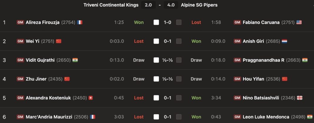 Long after the game was over, Firouzja was trying to get to the bottom of what had happened by replaying footage, but there was no real controversy, since Giri, Praggnanandhaa, and Mendonca had also won for the Pipers and only GM Alexandra Kosteniuk had managed to hit back.
