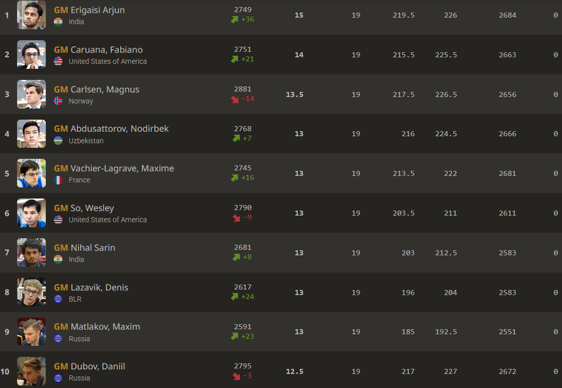 GM Magnus Carlsen continued to surge, winning an equal endgame for the umpteenth time in his career. GM Bu Xiangzhi had not lost a game by that point, and had he spotted the Nf1+ fork, he might have kept up his streak. With quick draws on board 2 between GM Yu Yangyi and GM Fabiano Caruana and board 4 between GM Maxime Vachier-Lagrave and GM Daniil Dubov, GM Arjun Erigaisi was not interested in any tame result against GM Lu Shanglei, playing an endgame with impeccable precision.