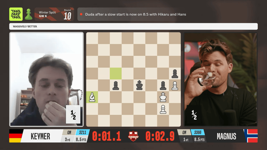 Prizes: Carlsen $1,000, Keymer $750, Duda $350, Tang $250, Henriquez $150, Grischuk $100, Savitha $100. Streamers’ prizes to be posted on the events page.