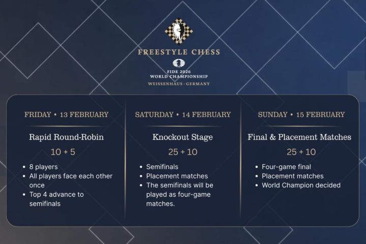 Sunday, February 15: The final, played over four games, and the placement matches use the same 25 minutes plus 10-second increment. In the final, the FIDE Freestyle Chess World Champion is determined.