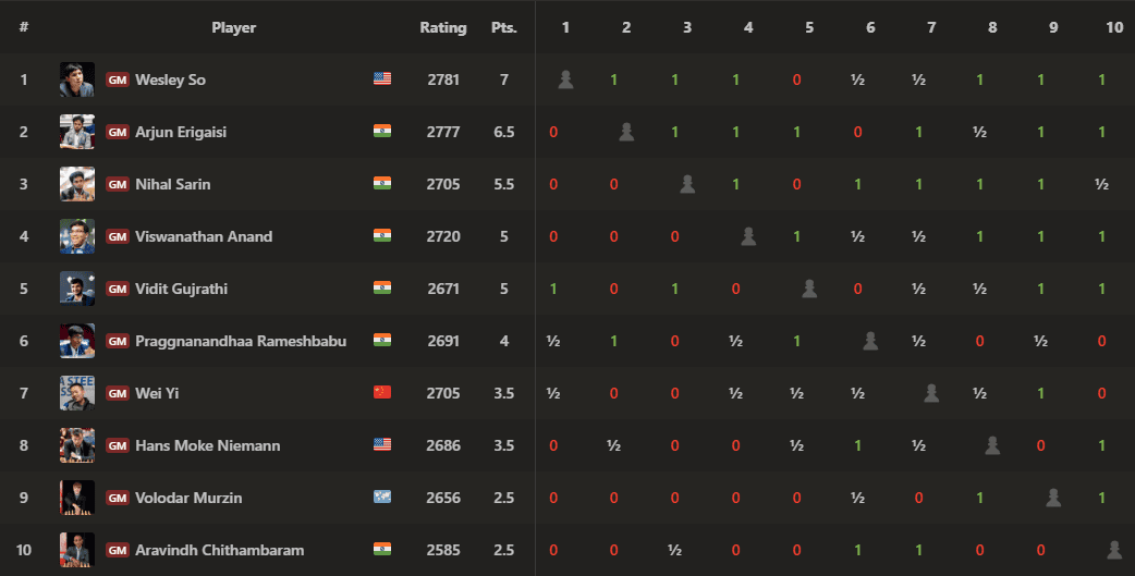GM Wesley So leads at the halfway point of 2026 Tata Steel Chess India Open Blitz with seven points out of nine games. After blundering into a mate-in-one the first game, So stormed back to snatch the lead from GM Arjun Erigaisi, who started with a perfect 5/5.