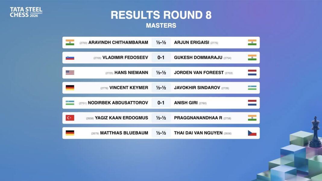 Tata Steel Chess 2026 Round 8: Giri Beats Abdusattorov As Gukesh Bounces Back