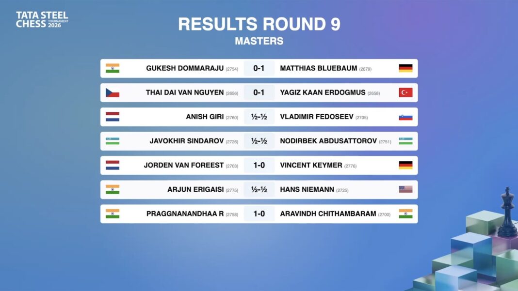 “I thought I’d never win a chess game again,” said GM Matthias Bluebaum after beating World Champion Gukesh Dommaraju with Black in round nine of the 2026 Tata Steel Chess Masters. GM Jorden van Foreest demolished GM Vincent Keymer in just 26 moves and is joined half a point behind leader GM Nodirbek Abdusattorov by 14-year-old GMÂ Yagiz Kaan Erdogmus, who outplayed GM Thai Dai Van Nguyen in time trouble. Defending Champion GM Praggnanandhaa Rameshbabu finally grabbed a first win, in an 84-move endgame grind against GM Aravindh Chithambaram.