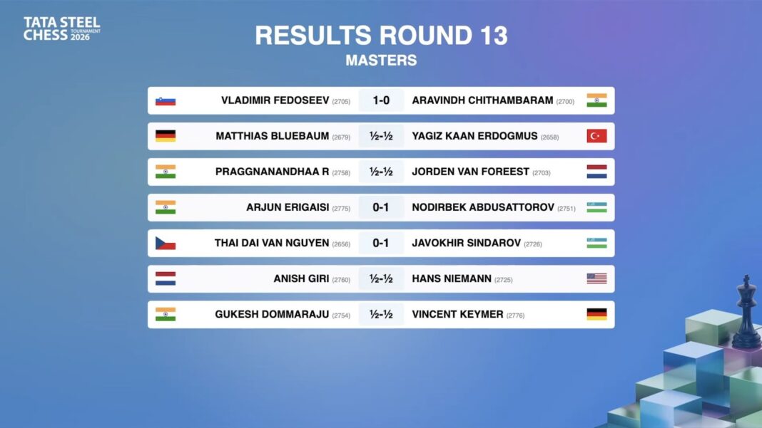 GMÂ Nodirbek Abdusattorov called it a “dream come true” as he defeated GM Arjun Erigaisi’s Evans Gambit to win the 2026 Tata Steel Chess Masters with 9/13. GM Javokhir Sindarov gambled to keep playoff hopes alive and ultimately beat GM Thai Dai Van Nguyen, finishing half a point behind and moving up to world number 11. GMs Jorden van Foreest, Vincent Keymer, and Hans Niemann finished a full point further back, with Van Foreest taking third on tiebreaks. Â