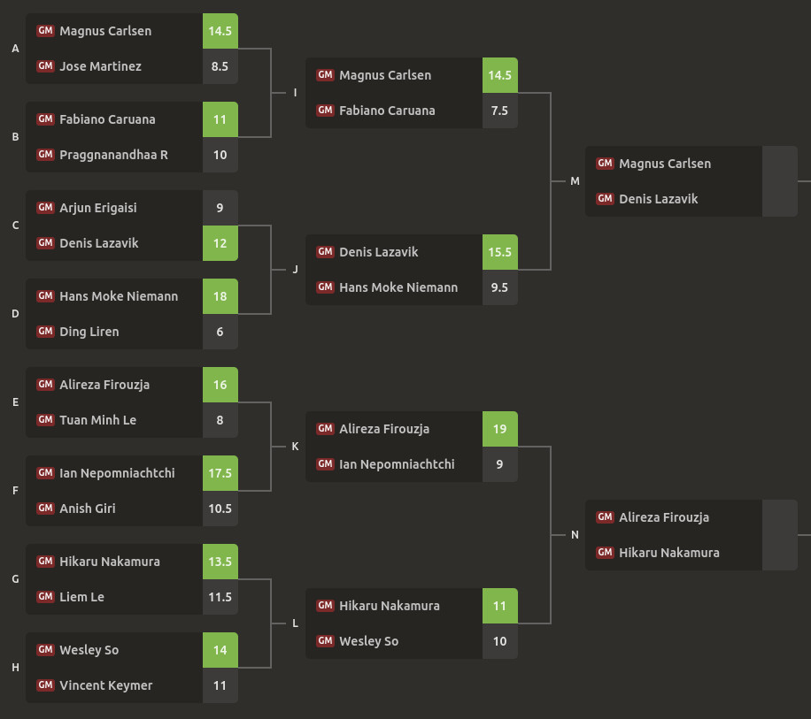 The semifinal pairings were decided by quarterfinal matches completed in November. Magnus Carlsen will meet Denis Lazavik, while Hikaru Nakamura faces Alireza Firouzja.