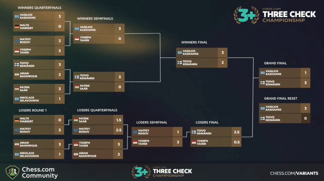 FM Vasilios Kasioumis, who was the runner-up last year, returned to win it all in the 2026 Chess.com 3-Check Championship. This year’s runner-up IM Toivo Keinanen did well to win the Grand Final 3-1, but he wasn’t able to win the Reset. Kasioumis struck back with a 3-0 sweep. IM Yoseph Theolifus Taher came third, while last year’s champion, FM Matfey Rogov, was fourth.