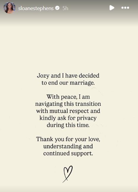 “Jozy and I have decided to end our marriage,” Stephens posted on Instagram Stories. “With peace, I am navigating this transition with mutual respect and kindly ask for privacy during this time.
