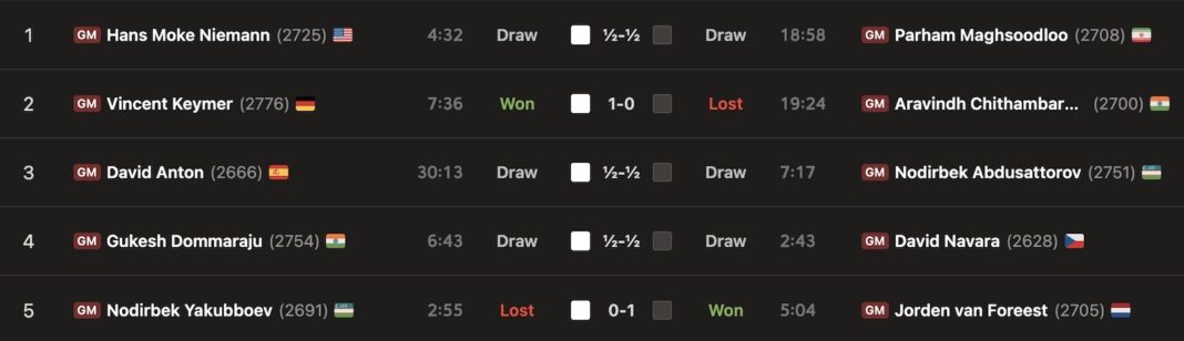 Van Foreest has a deserved lead but faces a tough test against Niemann in round five, when the most hotly-awaited contest will be the always intense Abdusattorov vs. Gukesh. Their clash in Wijk aan Zee ended abruptly with a blunder by Gukesh that neither player could explain.