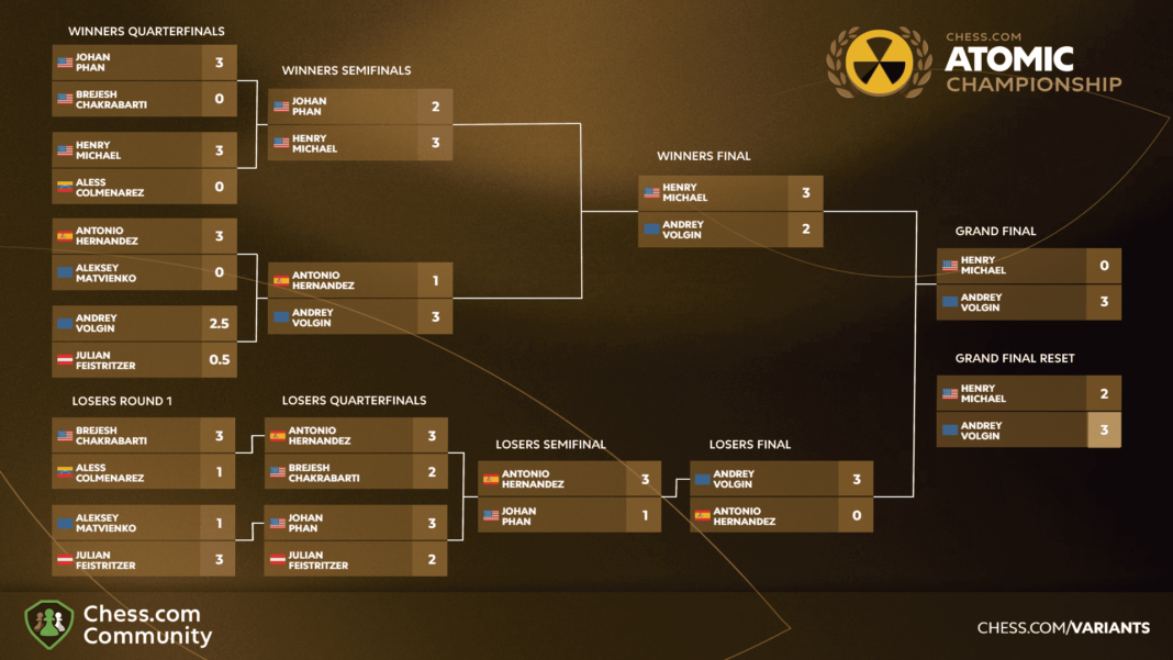 Andrey Volgin defeated Henry Michael through the Final Reset route to win the eight-player final of the Chess.com Atomic Chess Championship 2026. Michael defeated Volgin in a fight between the two untitled players in the Winners Final of the double-elimination bracket but then lost to him in both the Grand Final and the Grand Final Reset held on March 6. On the previous two days, eight players had advanced to the finals from as many Qualifiers.