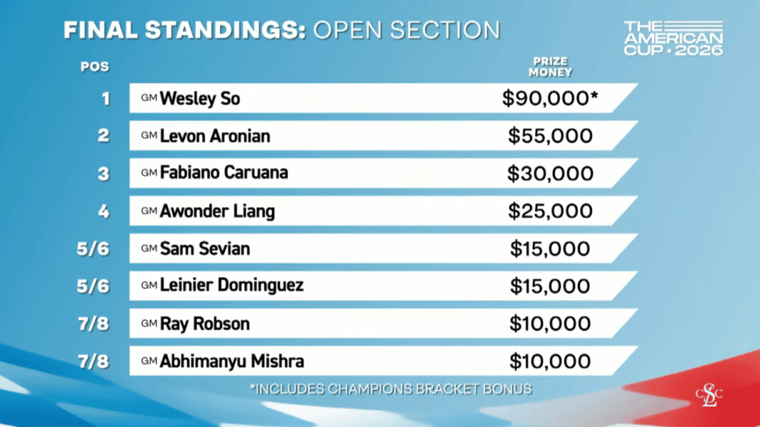 GM Wesley So won his maiden title in The American Cup 2026 on Wednesday. After winning the first game against GM Levon Aronian the previous day, he held the necessary draw in game two to secure the match. He makes $75,000 plus another $15,000 bonus for winning the Champions Final.