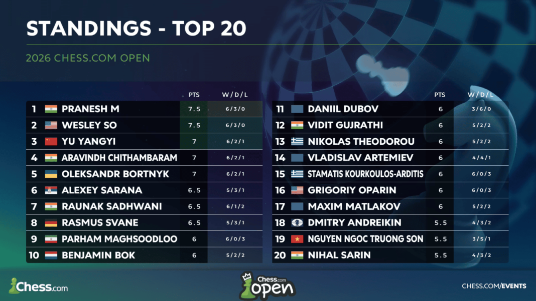 GMs Pranesh M and Yu Yangyi qualified for the 2026 Chess.com Open Playoffs through Play-In 2 on Wednesday. Pranesh advanced directly by having better tiebreaks than GM Wesley So, the only other player to finish on 7.5/9. Yu, who finished the Swiss in third place, defeated So in a match for the second spot.