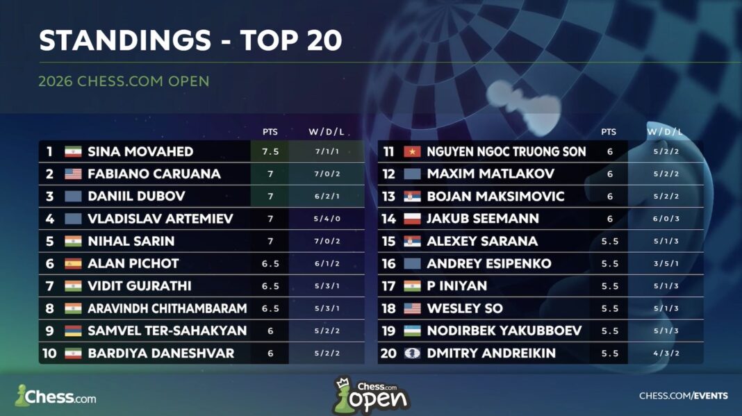Fifteen-year-old GM Sina Movahed won Play-In 3 of the 2026 Chess.com Open with 7.5/9 and picked GM Arjun Erigaisi as his knockout opponent. Four players scored 7/9, with GMs Vladislav Artemiev and Nihal Sarin missing out on tiebreaks, while GMs Daniil Dubov and Fabiano Caruana went to a playoff. Dubov won both games and said his first impulse was to pick GM Magnus Carlsen “without thinking for too long,” before choosing GM Javokhir Sindarov instead.Â