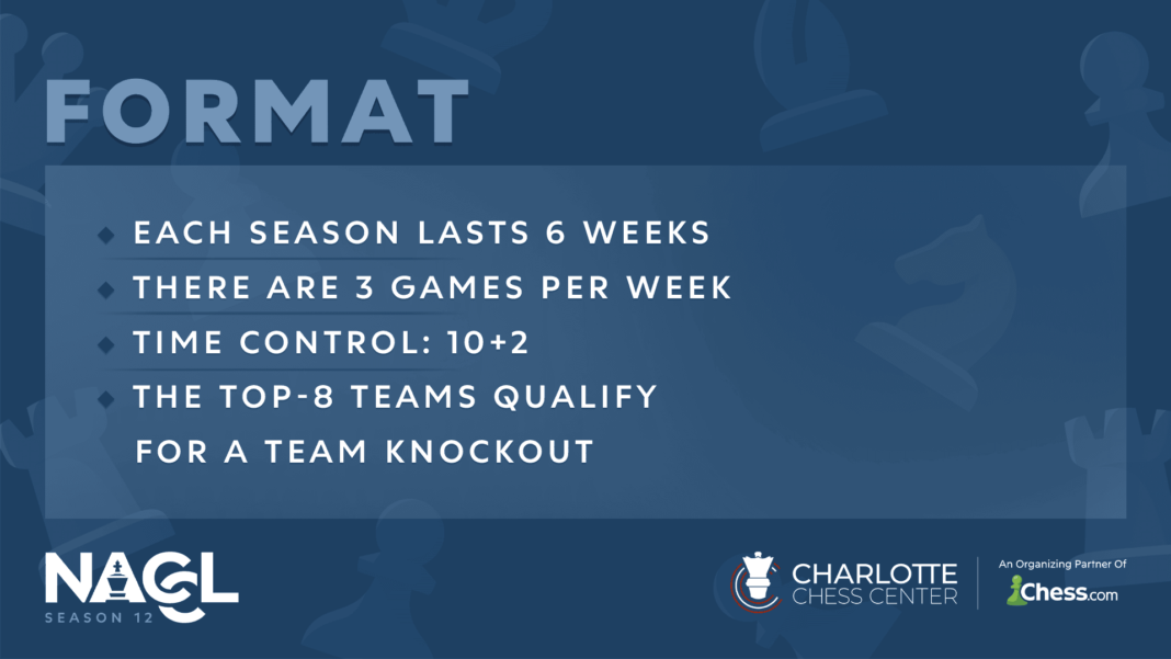 The upcoming season begins on April 16 and features six weeks of competition, culminating in a playoff on May 28. Each match features teams playing three rapid games (10+2), starting at 8 p.m. Eastern Time on Thursdays.Â