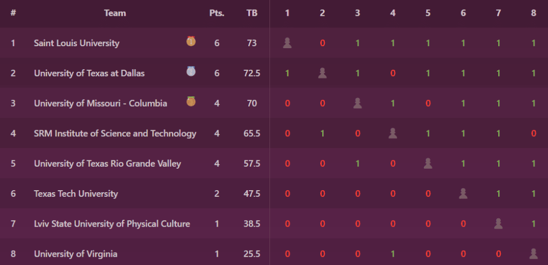 The defending champions, St. Louis University (SLU), narrowly earned the top seed before entering the Playoffs. They recovered well from an early loss to the University of Texas at Dallas (UTD) to win their remaining matches. UTD, which had started strong, had just one poor match, but their 11-5 defeat at the hands of SRM Institute of Science and Technology (SRM) was enough to drop them out of first place by the narrowest of margins, a half point in the tiebreaks behind SLU.