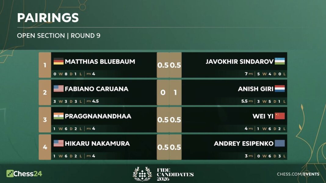 GM Anish Giri played a positional masterpiece to take down GM Fabiano Caruana and grab sole second place in the 2026 FIDE Candidates Tournament after round nine. GM Javokhir Sindarov could have scored a record sixth win, but slipped up against GM Matthias Bluebaum and saw his lead cut to 1.5 points. Elsewhere GM Praggnanandhaa Rameshbabu spoiled a winning position against GM Wei Yi, while GM Andrey Esipenko survived a long grind by GM Hikaru Nakamura.